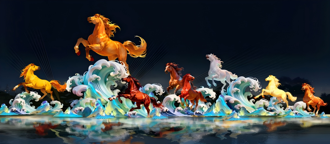贴合马年从题的超大型水面灯组“光驰八骏”可谓点睛之笔,本届灯会沉磅升级、欣喜拉满,伸手就能和这些“科技萌物”合拍,双凤华美制型搭配绣球、鼓乐元素,火壶等特色非遗表演每晚双场上演!